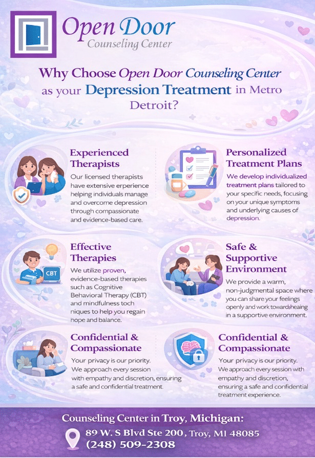 Open Door Counseling Center in Clinton Township and Troy, Michigan, provides evidence-based therapy across the lifespan and welcomes nearby communities.